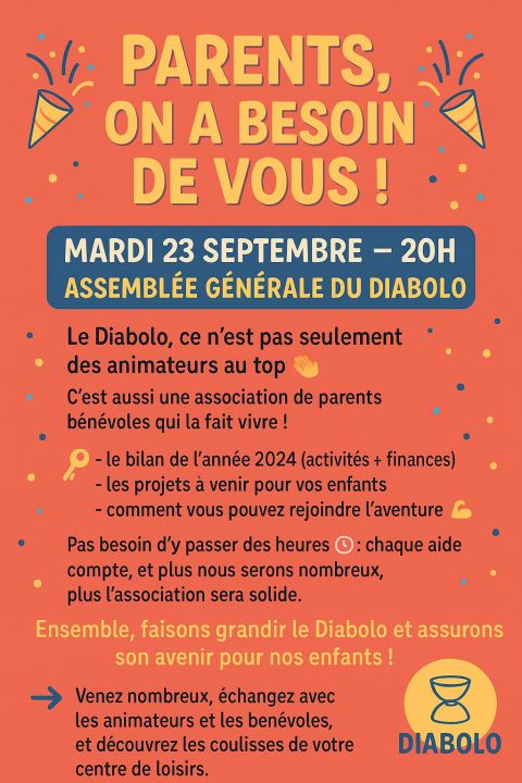 N’hésitez pas à interpeller nos animateurs pour toute question et venez nombreux à l’AG pour échanger avec l’ensemble du Diabolo (salariés et bénévoles) et mieux connaître la structure qui accueille vos enfants.